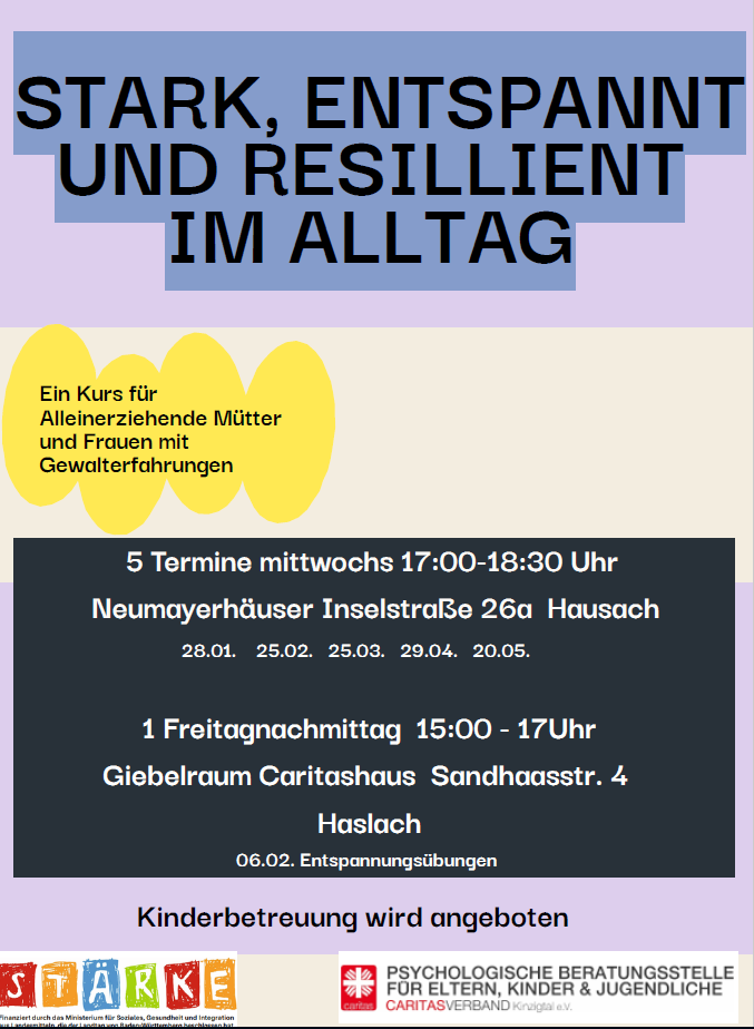 Dieser Kurs bietet praktische Techniken zur Stressbewältigung und Resilienzförderung. Er richtet sich an Frauen, die neben den Herausforderungen des Alleinerziehens auch belastende Erfahrungen verarbeiten müssen. Die Teilnehmerinnen lernen, ihre eigenen Bedürfnisse ernst zu nehmen, Grenzen zu setzen und Stress im Alltag zu reduzieren. Neben Entspannungstechniken stehen Selbstfürsorge, der Umgang mit schwierigen Gefühlen und der Aufbau eines unterstützenden Netzwerks im Fokus.